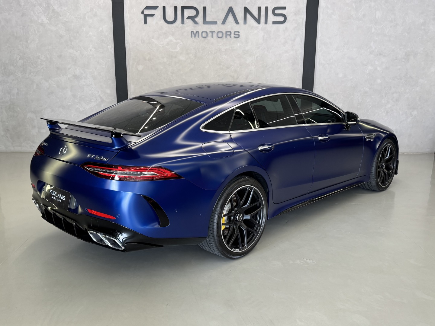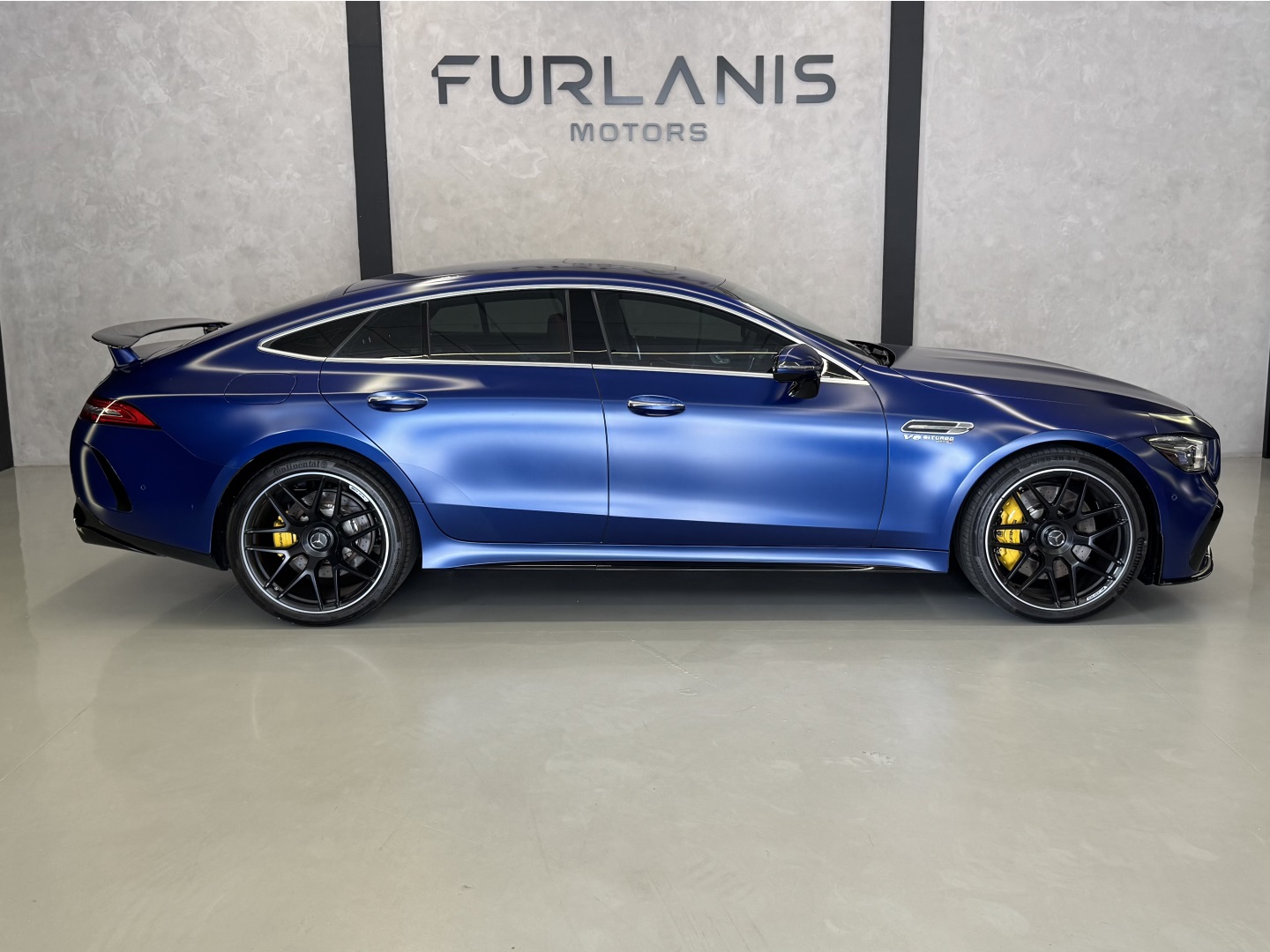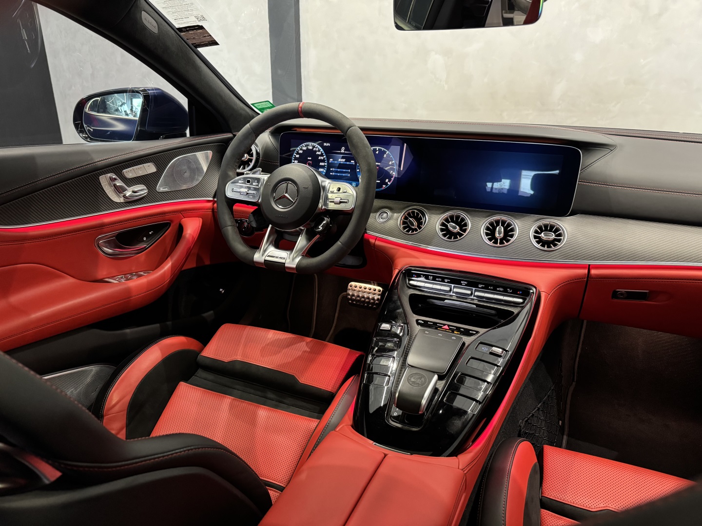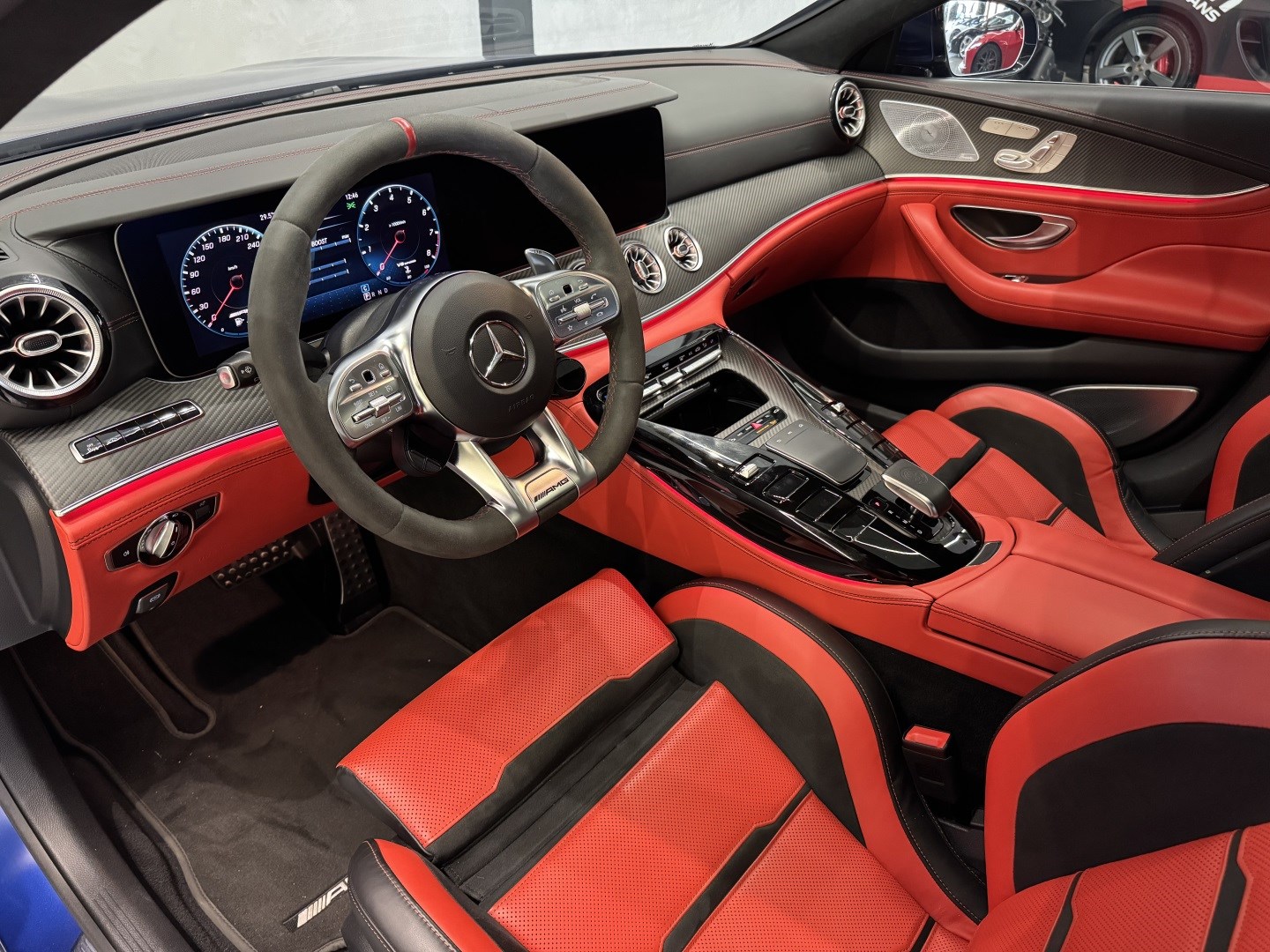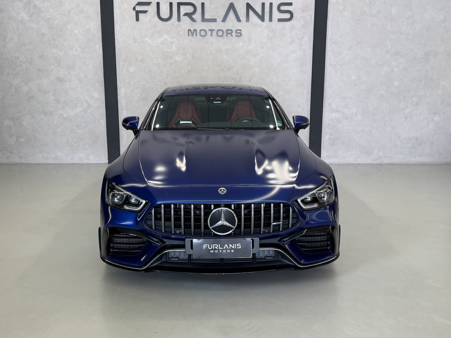 Motor V8 biturbo com câmbio automático Speedshift e tração integral 4MATIC+. Cor azul com interior em couro vermelho e preto.Versão AMG GT 63 com pacote esportivo, rodas AMG, freios de alta performance e escape esportivo. Faróis full LED.Multimídia MBUX, ar-condicionado digital e acabamento premium.
