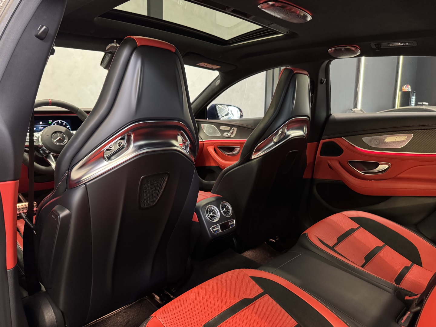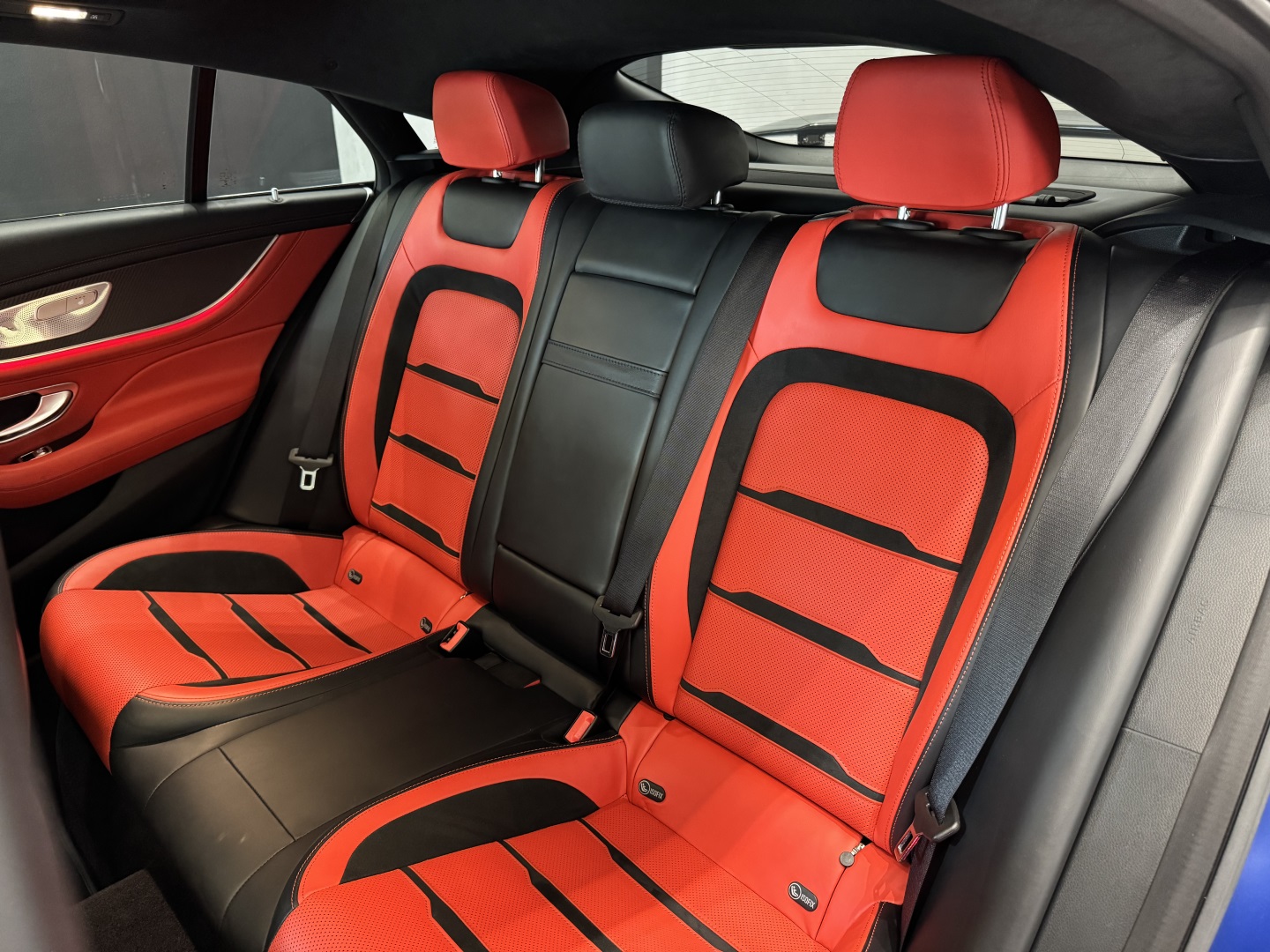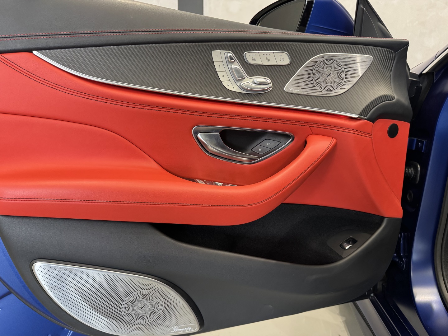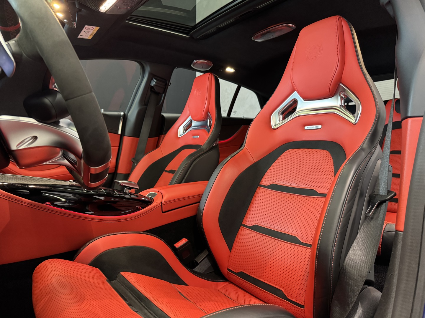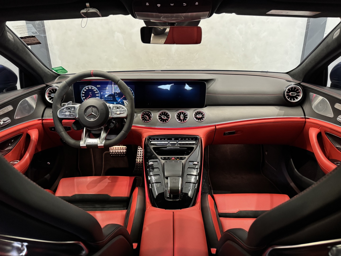 Motor V8 biturbo com câmbio automático Speedshift e tração integral 4MATIC+. Cor azul com interior em couro vermelho e preto.Versão AMG GT 63 com pacote esportivo, rodas AMG, freios de alta performance e escape esportivo. Faróis full LED.Multimídia MBUX, ar-condicionado digital e acabamento premium.